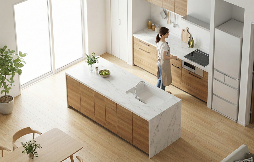 一般的に、主に1人で調理を行う場合は「80cm~90cm」程度の幅が適切と言われています。この距離であれば、一歩踏み出すか、あるいは体を回転させるだけで背面のカウンターに手が届くため、非常に効率的な作業動線が確保できるからです。